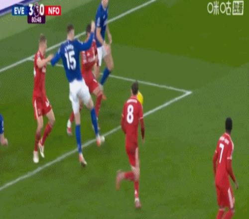 第80分钟,霍尔禁区内低射破门,埃弗顿3-0森林