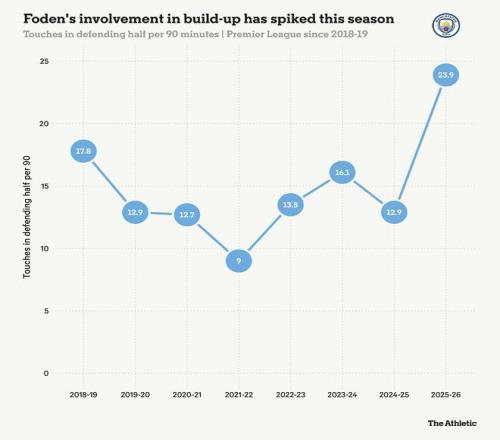 英格兰队主教练托马斯-图赫尔已确信他属于中路,在那里,他对比赛的影响力比以往任何时候都大。罗德里本赛季长期缺阵可能是一个因素,但如下图所示,福登回撤接应、帮助曼城破解对手高位逼抢的次数也达到了前所未有的程度。